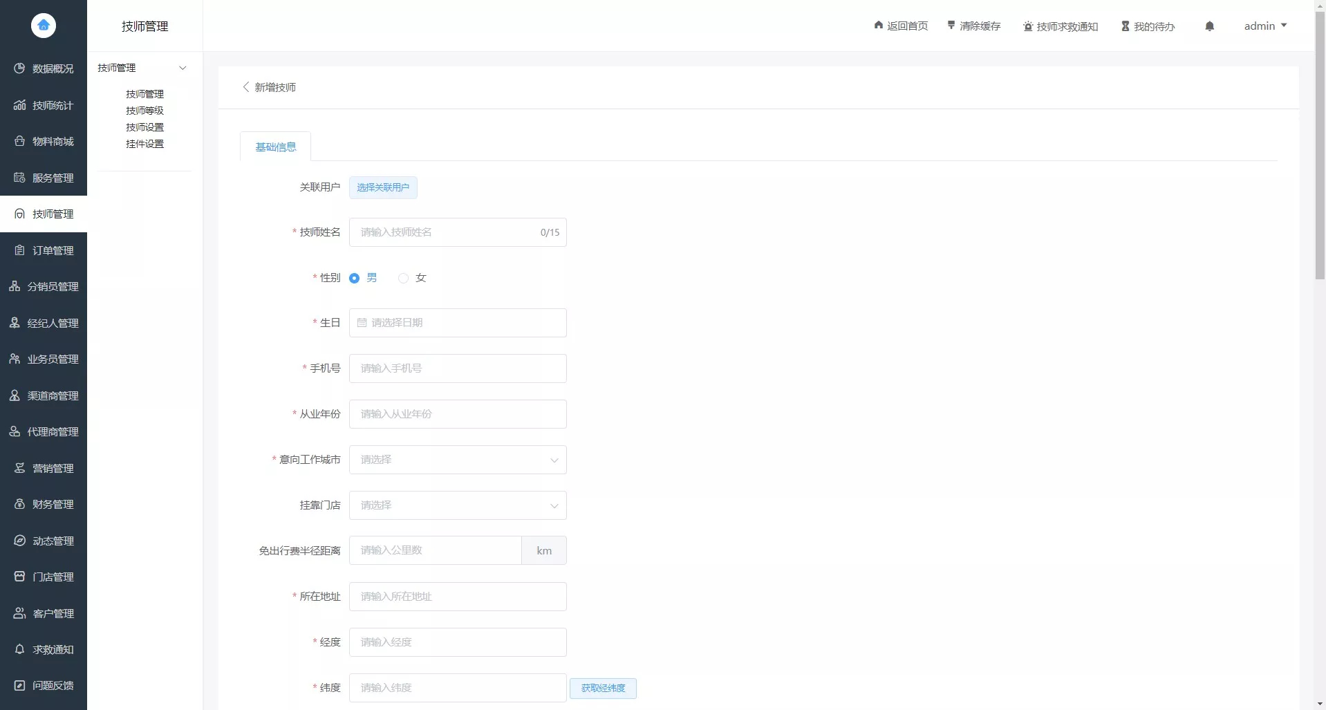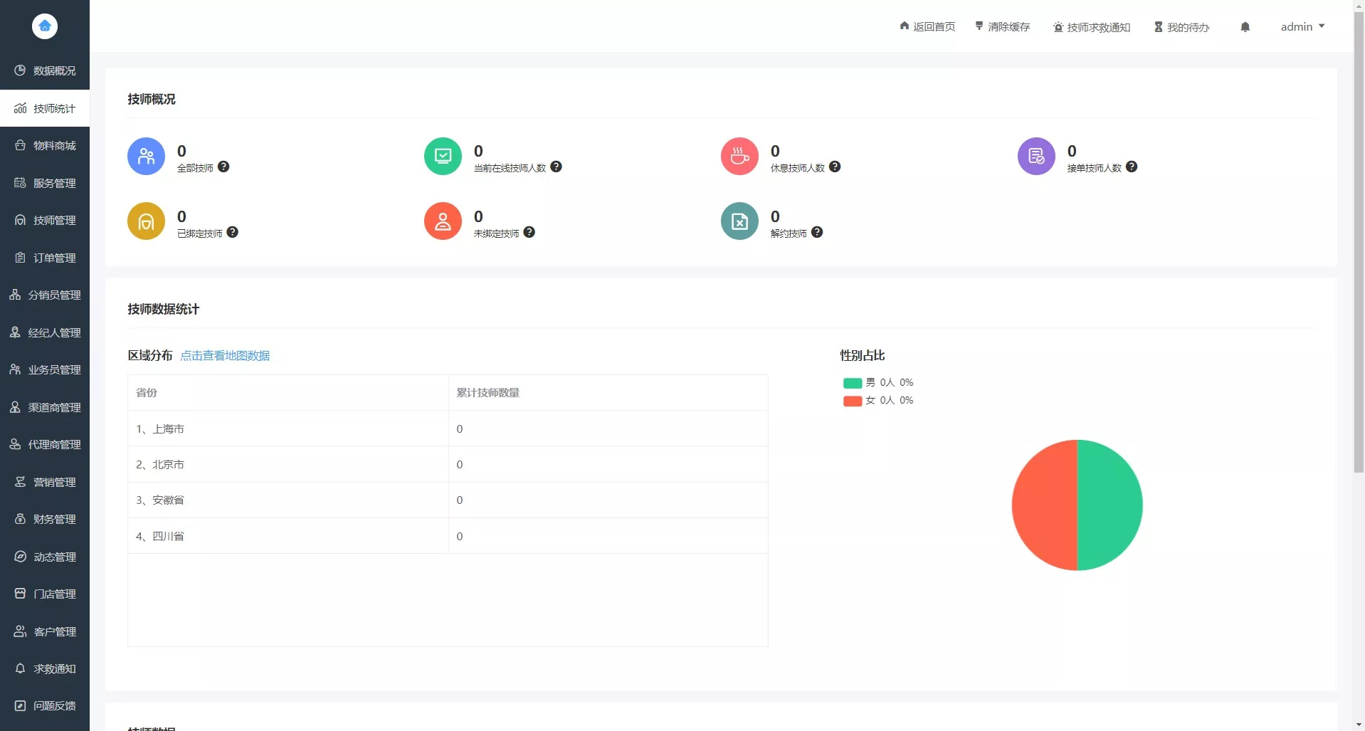 27、后台新增:技师统计(技师概况、技师数据统计、区域分布、技师数据等,可视化数据一目了然)