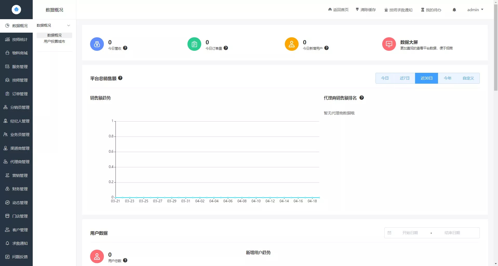 2、数据概况 (增加可视化数据大盘,代理商端可查看自己下面的技师服务时长、在线时长、业绩、积分、加钟率、退单率、退单数量、总订单量等数据,更加直观的查看平台数据,便于招商 )