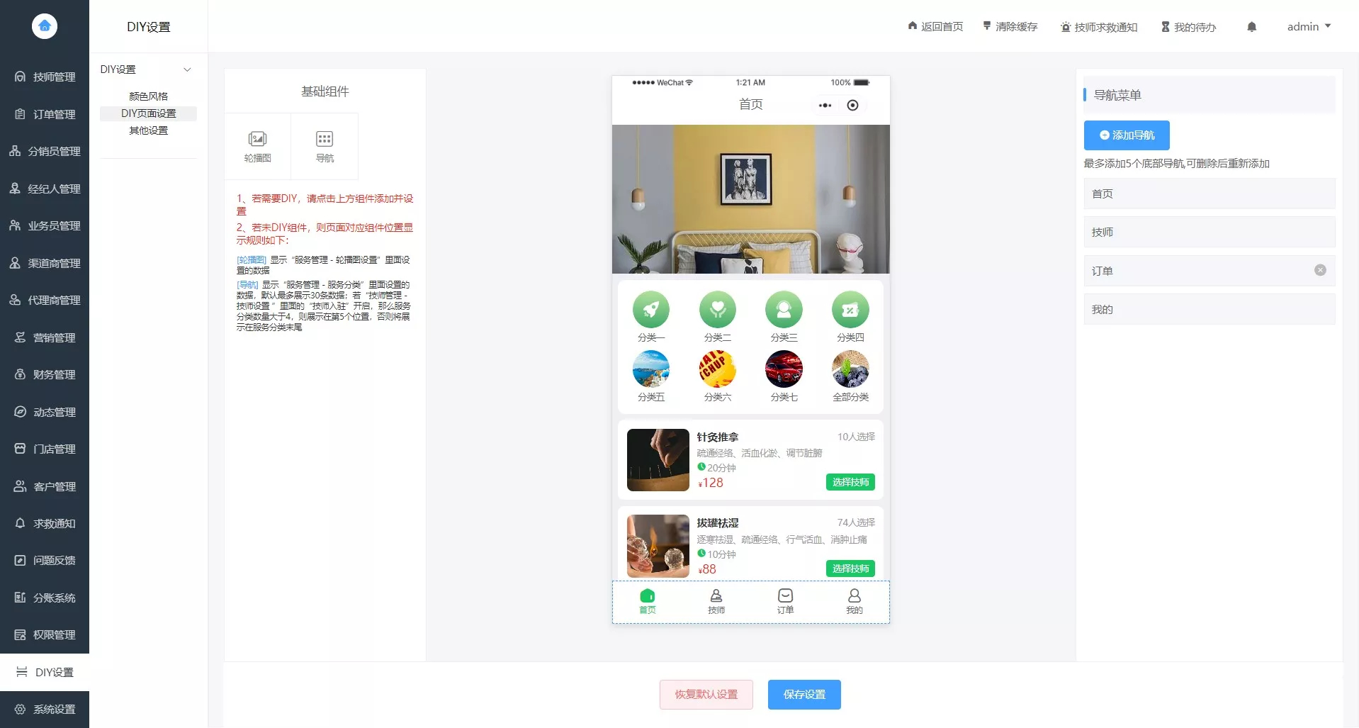 16、DIY设置( DIY页面设置,用户可以自由排版,任选链接页面或加减底部菜单 )