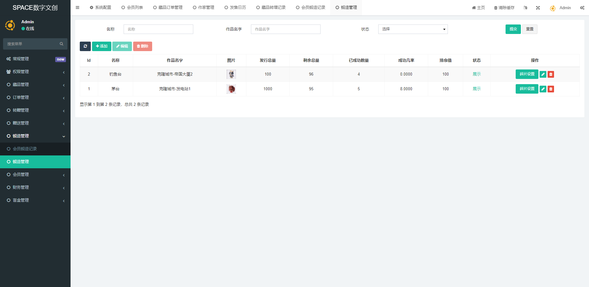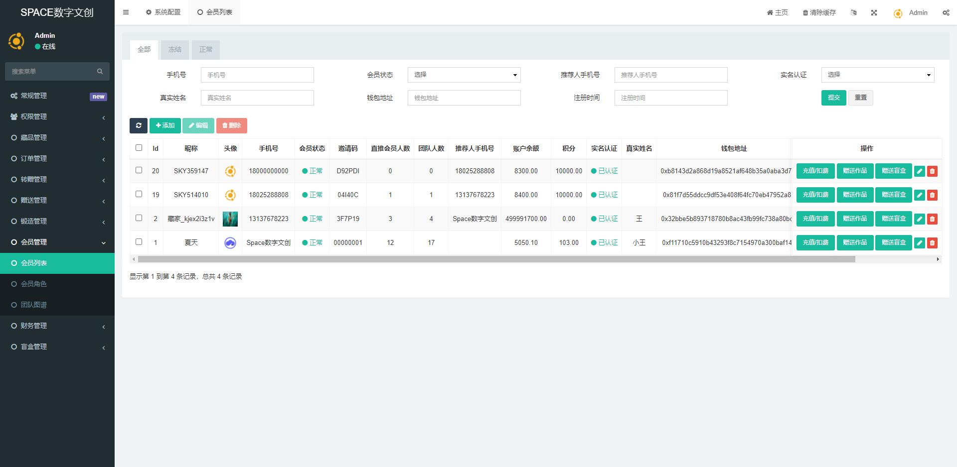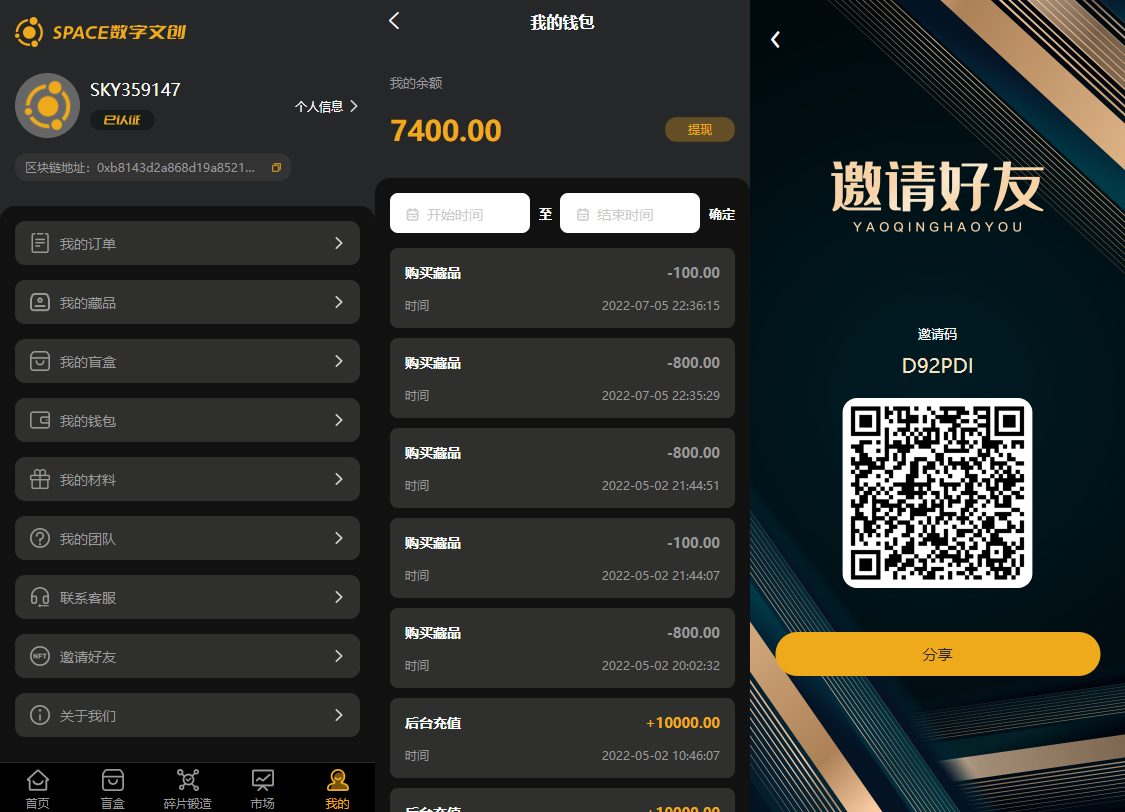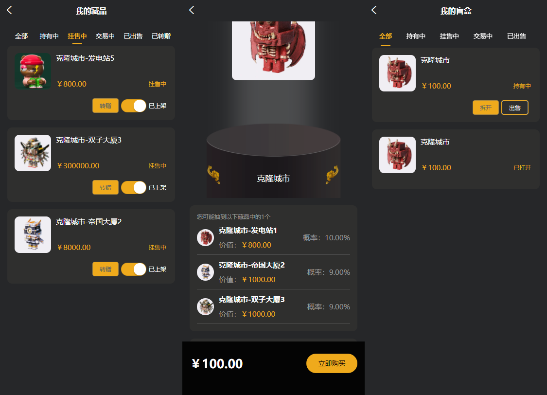 数字藏品、盲盒、碎片锻造、转增、盲盒转增、盲盒出售、有市场(出售盲盒,或者自己的数字藏品都会在这里显示)、邀请功能、团队下级等